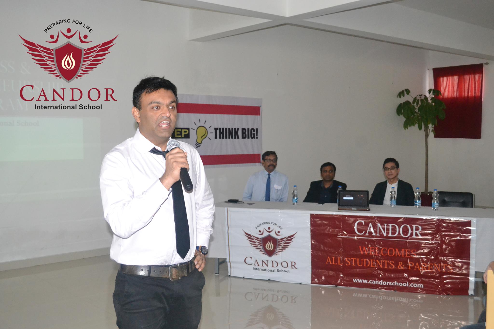 Over several weeks a variety of stimuli were used to arouse the curiosity of the students about something special that was going to happen. There was a buzz in the school regarding the event and the student was eagerly waiting to discover the ‘secret’. Finally on Friday 27, 2015 at 1.30pm the Business & Entrepreneurship Programme at Candor International School was launched. The man behind the idea is the International Advisor Mr. Jalaj Desai, who runs a similar programme in Rutgers School in the US. Students from Grade-7 and above gathered in the dining hall. Mr. Garry Ang, former Head of Retail Banking, ANZ Bank (China) and a member of Board of Advisors of the school was present on the occasion.