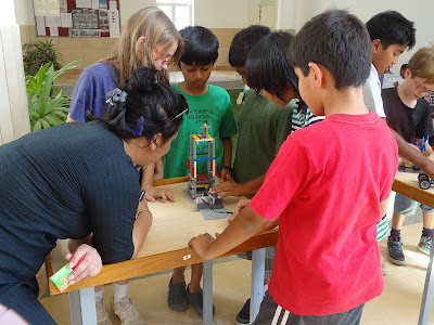 Joseph and Abby from grade 4 made the working model of an elevator with pulley belts. Grade 5 students used Scratch and programmed games for their friends. Grade 6 students Kishan, Eashwar and Aarya displayed and explained about Tentomushi/Ladybug which is a robot programmable using only black and white lines.